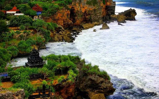 Pantai Ngobaran terletak di Gunungkidul dan terkenal dengan pura Hindu yang terletak di atas tebing karang, menciptakan pemandangan yang eksotis dan religius.Fasilitas