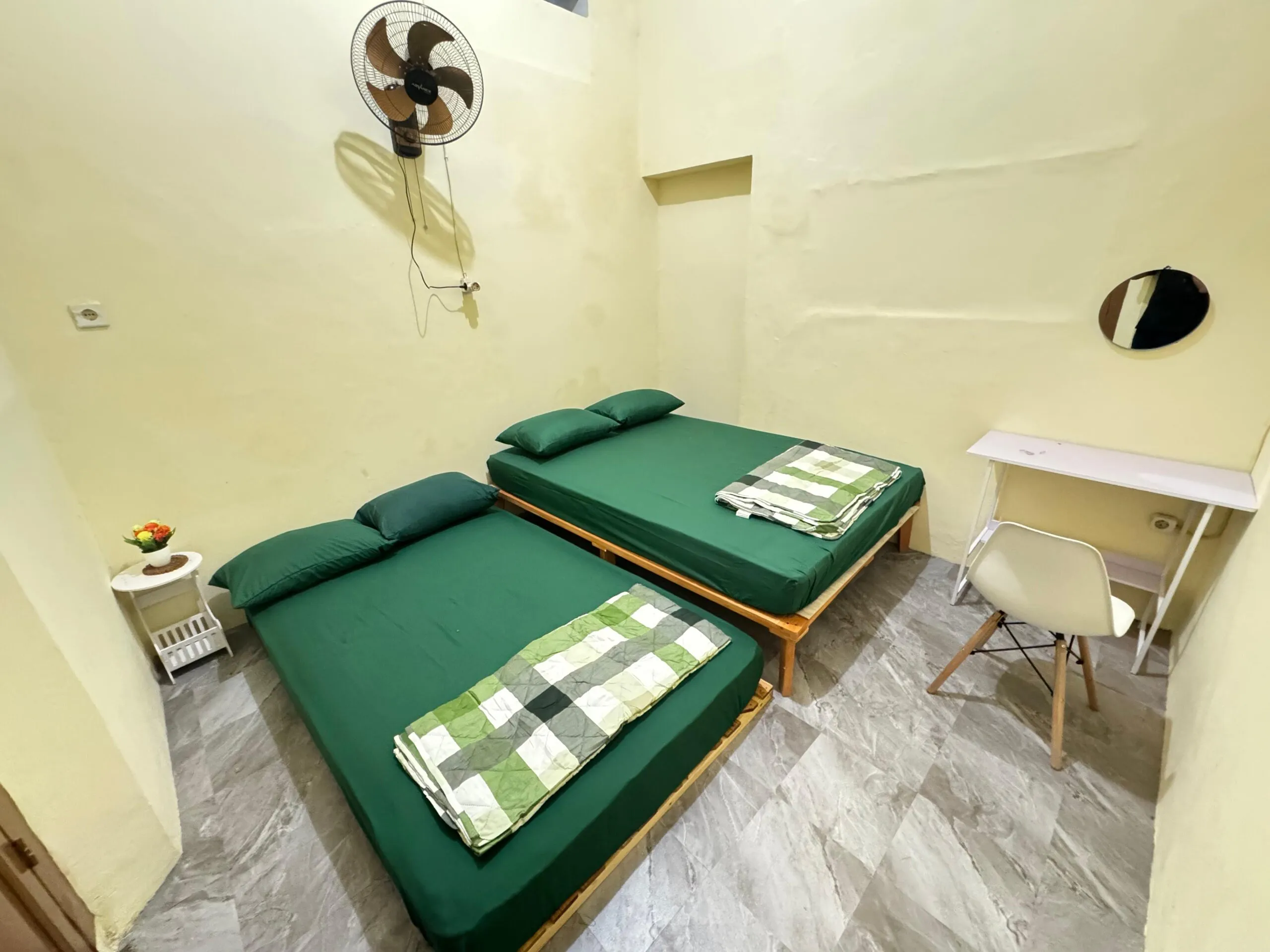 Semua kamar hanya dilengkapi kipas angin, bukan AC. Namun, udara Jogja di malam hari cukup sejuk bagi kebanyakan tamu.